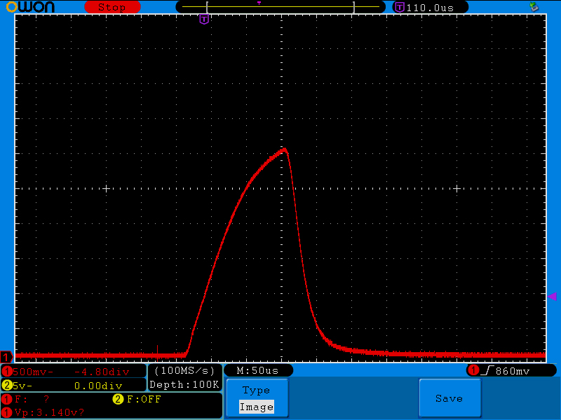 Because the rise time of the light putput now determines a significant portion of the light curve, the different timing levels are rather different. This is beginning to be in the ballpark for stopping falling water drops.